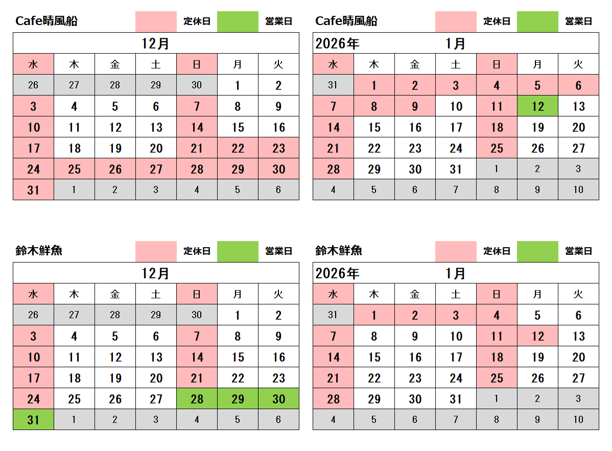【Cafe晴風船】の新年の営業のご案内